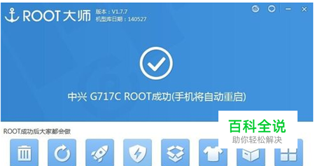 等待1~3分钟左右,Root大师会显示中兴青漾2(G717C)获取Root权限成功,然后手机会自动重启一次,如下图;