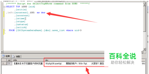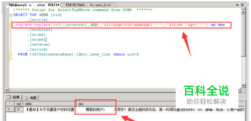 在mssql中执行查询语句,命令如下: SELECT TOP 1000 [nid] ,[ntitle] ,left([ncontent],100) as des ,[ncontent] ,[ntime] ,[ntype] ,[nstatus] ,[nclick] FROM [IDCSystemDataBase].[dbo].news_list where nid=3 结果会看到查询之后,会多了一个字段des,并且这个字段里面只有前面100个字符。