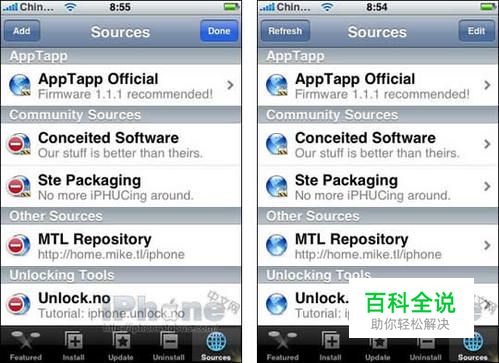 升级好后,请点击界面右下角的“Sources”按键,点击“Edit”,再点击“add”,在地址栏目中填写 http://i.unlock.no ,点击“save”保存,然后在点击“Refresh sources”,刷新后你就会看见Unlocking Tools栏目下有“Unlock.no”。