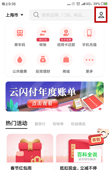 云闪付想要联系人工客服的话需要在首页里点击右上角的【个人中心】选项,如图所示。