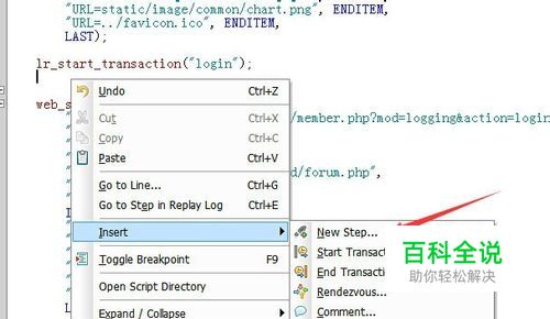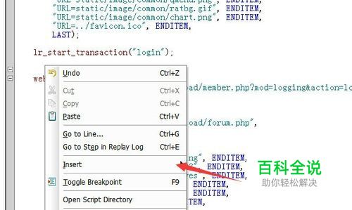 做为例子,首先使用录制的方式,把论坛的代码编写完成后,要判断的执行前插入检查点,使用右键方式,弹出的下拉的菜单中进行选择“insert”的选项。
