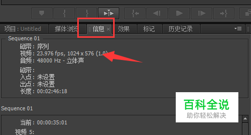打开PS,新建一个文件,文件的大小和PR中视频序列的尺寸一样。如果不知道视频序列的大小,可以在PR中,选中视频序列,选择信息面板,就可以查看视频尺寸的信息了。如图所示,我这里的尺寸是:1024X576。