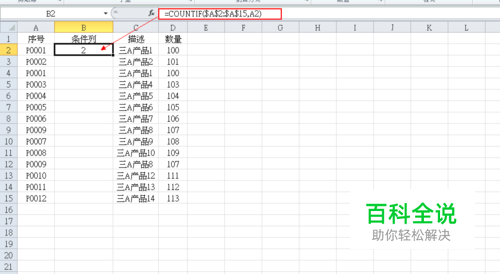 在插入的列中写入公式: =COUNTIF($A$2:$A$15,A2),结果等于2,表示在我们选取的范围内出现了2次。