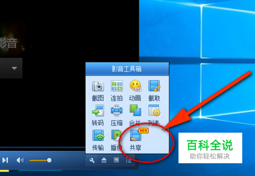 如图所示,点开工具箱里边的“共享”菜单,然后就可以把电脑的视频共享给手机了。