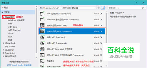 在新建项目部分,选择visual C#,项目类型选择控制台应用(.NET Framework)。 输入项目名称,选择保存路径。 注意:此处建议项目名称为英文,项目存储路径英文路径。