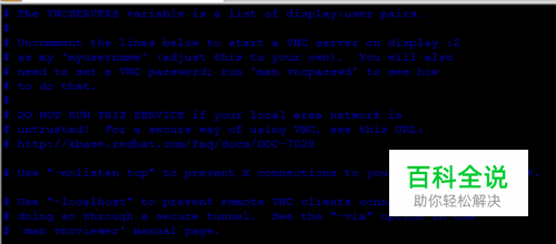 修改VNCServer主配置文件 #vim /etc/sysconfig/vncservers 复制最后两行并去掉行首注释符,然后修改为 VNCSERVERS="1:root" VNCSERVERARGS[1]="-geometry 1024x768"