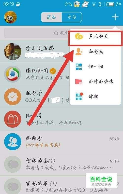 打开QQ后点击右上角的“+”号按钮后选择“多人聊天”