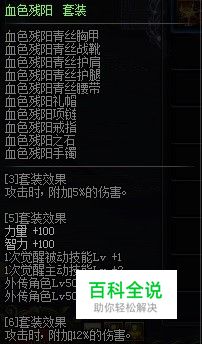 血色残阳(兰总): 兰总是一套很受搬砖玩家欢迎的远古套,提供大量的攻速、移速和释放速度,最重要的是,兰总5件防具都提供 独立攻击力加成。 6件有17%附加伤害加成(白字),加技能又增加100点力量。 只推荐兰总6