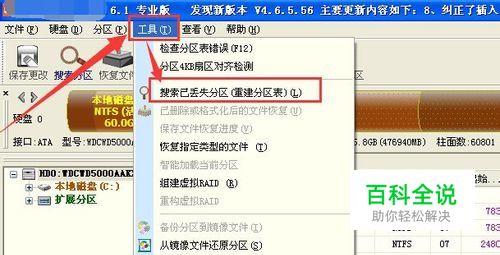 点击“工具”--“搜索已丢失的分区” 已丢失的分区其实就是完成恢复分区表的功能。