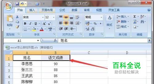 首先我们要了解excel柱形图的基本信息需要包含横向值与纵向值,也就是说我们再excel中的数据必须包含这两个基本值才行,如图,有两个基本值,一个是姓名,另一个是对应姓名的语文成绩。