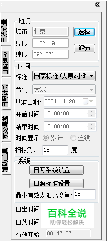 进行日照设置 : 包括地点、时间、系统设置和标准设置,对已分析过的图形无需再进行设置。