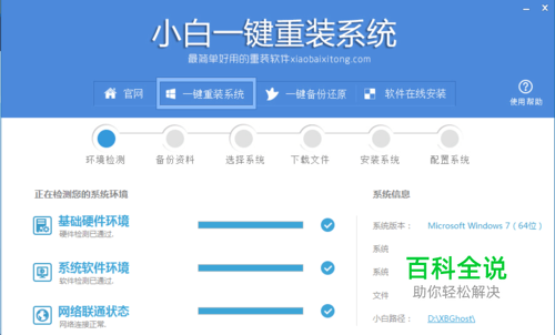 软件自动检测电脑软硬件环境以及电脑网络连通状态,完成后点击下一步按钮。如图: