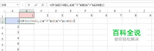现在我们开始来用公式实现乘法计算的格式,我们知道它的列表示方法这样的: 1*1=1,2*1=2...,即就是第一个因数加1,第二个因数不变,加1的情况我们采用相对引用,后面的一个采用绝对引用,这样,我们只需要比较一下第一个因数和第二个因数的大小时,若大于或等于,再用连接符将乘号和等号连接起来,就执行乘法,这样就能出现结果了。于是我们在B2单元格中输入公式:=IF(A$2>=B$1,A2&"×"&B$1&"="&A2*B$1)。