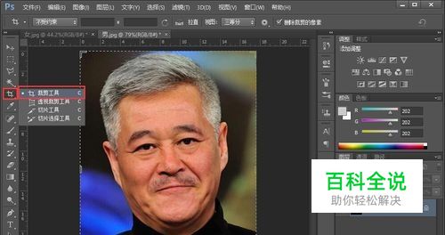 在你要替换的人物图层上,选择左侧的“工具栏”里的“裁剪工具”。