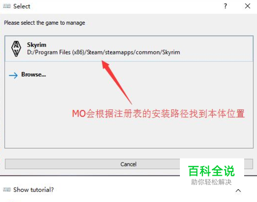 打开MO会让你选择游戏本体,注意游戏本体路径,如果不对自行选择点Browse..