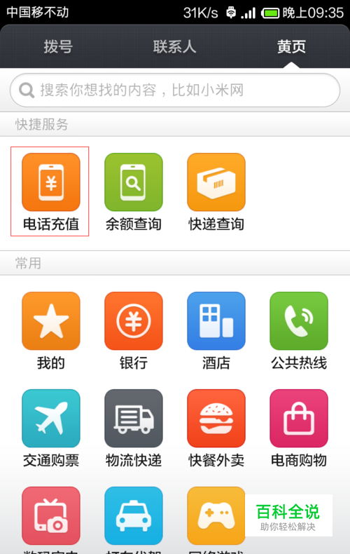 打开“联系人”应用,向左滑动,可以看到非常齐全的“黄页”,在“黄页”第一栏快捷服务中选择“电话充值”;