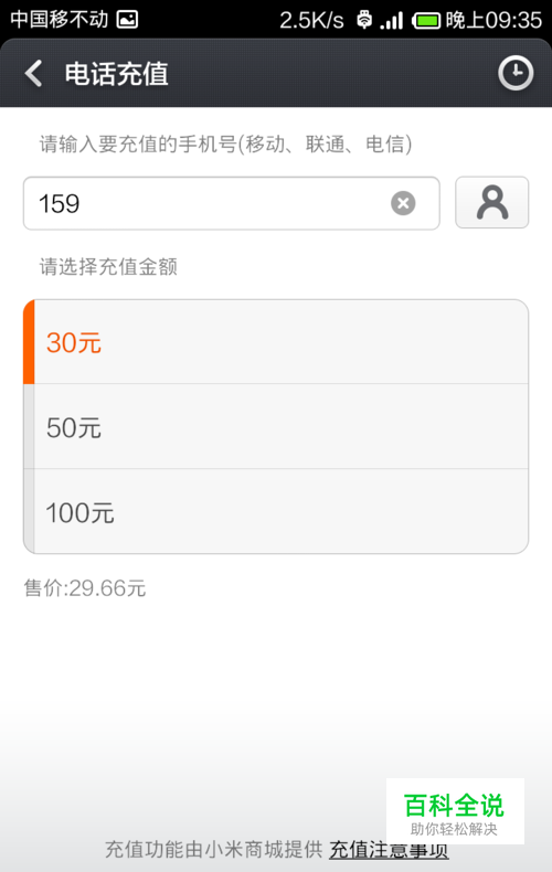 电话充值可以为电信,联通,移动任何一家,可选充值金额有30,50,100三个档,输入手机号并选择需要充值的金额,点击“立即充值”;