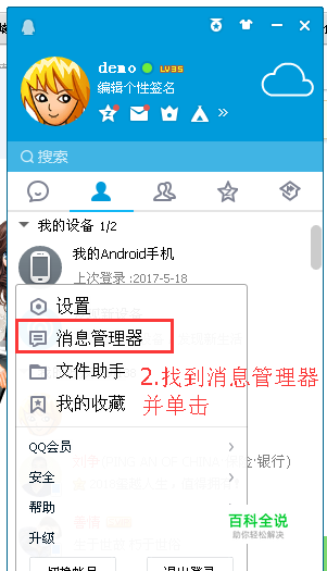 我们先需要找开qq软件中的“消息管理器”,如下图可以找到。