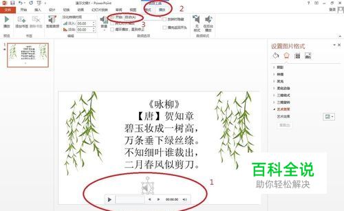 像这些诗词简短花费时间不多,如果内容比较多,可以把内容按一段段文字来出现,分多个PPT来展示。不过这时就是要设计每一个幻灯片出现和停留的时间,并且动画也是选择自动播放方式。这时选择的是切片——持续时间,以此来制作音频字幕同步,然后自动跳转下一页