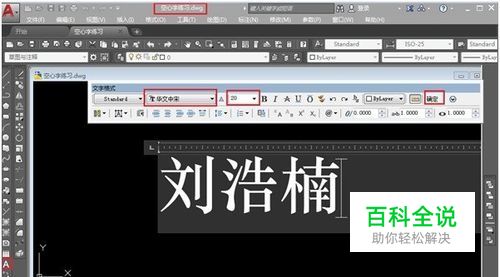 新建文件“空心字练习”,在命令栏键入“Mtext”(多行文字)命令,或者点击绘图工具栏的“A”,打开“多行文字编辑器”,“字符”标签里选择一种中文字体,例如“华文中宋”,字高20毫米,并输入“刘浩楠”三个字,点击“确定”,关闭文字编辑器。