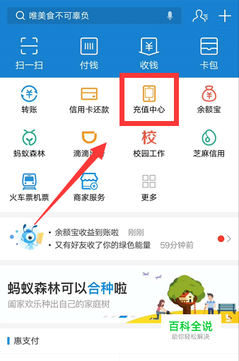 打开手机支付宝,点击【充值中心】。