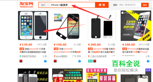 打开淘宝搜索“手机型号+触摸屏”例如搜索iPhone 5触摸屏,然后打开自己喜欢的一个宝贝。