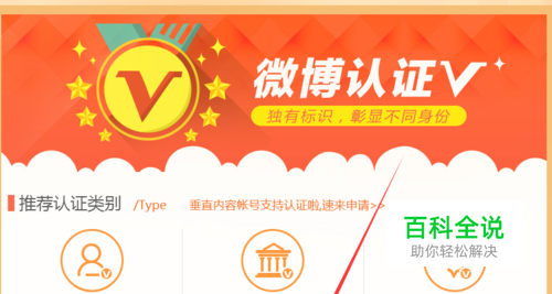 登陆新浪微博,点击主界面右上角设置按钮,点击“ V认证”进入认证类型页面。