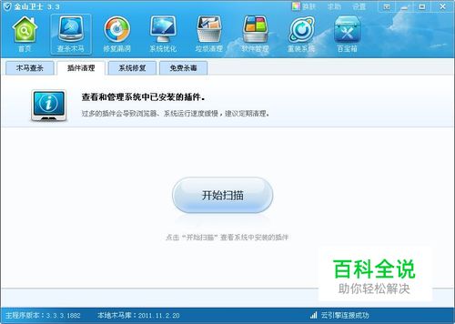 还有,病毒、插件也将影响我们的网络速度。建议在安全模式下,使用杀毒软件从多方面下手修复、查杀、清理插件。例如使用《金山毒霸》+《金山卫士》等。