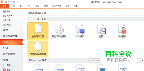 打开PPT 2010软件,将会出现一个空白文档。点击“文件”选项,在下面的子选项中,再点击“新建”选项。