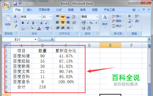 首先我们要有一个原始数据,并进行简单处理,一列为项目数值,一列为项目的累积百分比,接下里就可以做柏拉图。