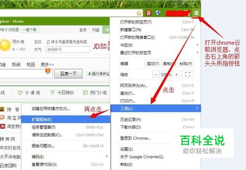 打开浏览器,选择选项,进入扩展程序界面。