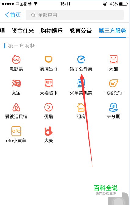 在全部应用中,找到“第三方服务”,这是支付宝和一些第三方的合作,集成了一些第三方的功能,点击里面的“饿了么外卖”,如图所示。