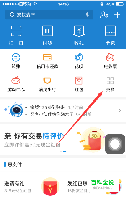 登录支付宝后,打开支付宝首页,点击应用中的“更多”,如图所示。