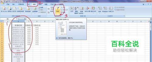选中兑换成功所在的列,然后选择数据,点击筛选。