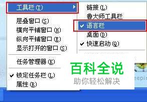 第二步,打开“语言栏”菜单,右键点击任务栏上的空白处,一定要是空白的地方,在弹出的菜单中鼠标指向“工具栏”,在工具栏中勾上“语言栏”即可,现在检查一下输入法图标是否已经出现,如果问题依旧,请接着往下看;