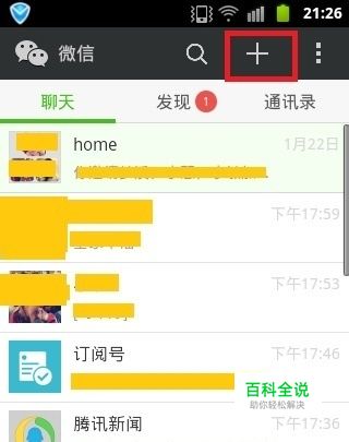运行手机上的微信app,点击主界面右上角的加号“+”