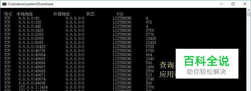 打开“命令提示符”对话框,如图所示,输入命令:netstat -ano 并回车,列出所有端口。