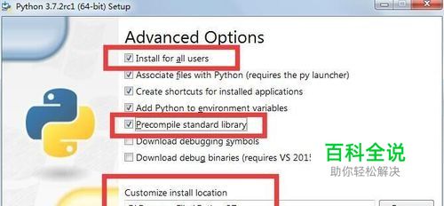 第四,接着是Advanced Options这一步,选择Install for all users,Associate files with Python,Create shortcuts for installed applications,Add Python to envrionment variables,Precompile standards library复选框,定义安装路径,可以安装默认安装路径,然后点击Install(安装)。