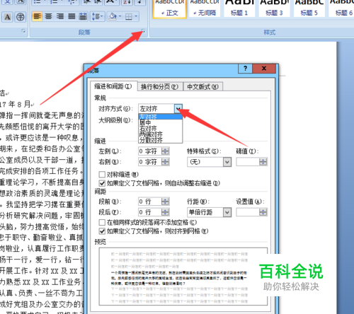 第五步:段落对话框设置对齐方式,单击段落栏右下角三角形出现段落对话框,在对话框内进行设置对齐方式,单击确定即可。