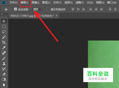出现上述问题,是PS软件首选项中的设置问题。打开PS软件,在左上方找到“编辑”菜单栏。