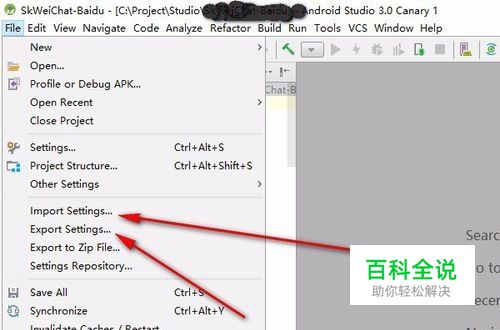 找到Export Settings菜单 打开原Android studio之后,点开右上角的菜单 File,然后选择Export Settings...