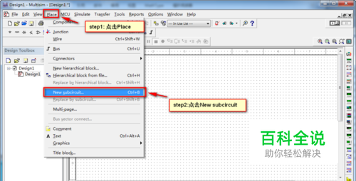 创建子电路图 step1:点击菜单栏的Place菜单 step2:点击New subcircuit
