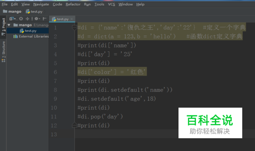 最后给大家介绍下怎么删除字典里面的元素。通过pop方法我们可以指定删除对应的元素。在test.py文件中输入 di.pop('day') print(di) 然后右键点击运行,就可以在运行结果中看到‘day’的键值对没有了