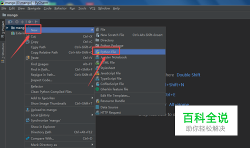 打开PyCharm,右键点击创建好的项目名,选择【new】-->【Python File】新建一个python文件。文件名根据自己情况填写。这里小编以test.py文件为例。