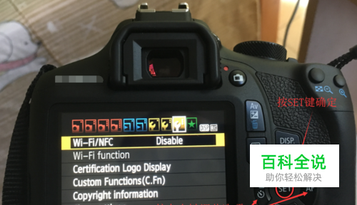相机端设置NFC功能 (1) 打开相机,按“MENU”菜单 (2)按SET,左右键切换为Enable,使NFC( 近距离无线通讯技术)功能加载 (3)第一次使用时,会提示登录一个用户名,按MENU,按OK结束,
