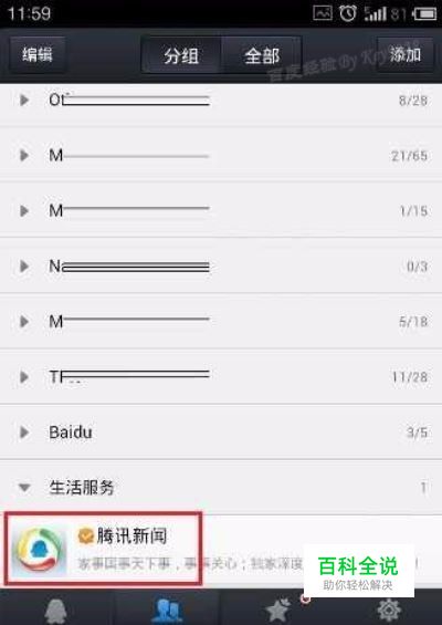 有腾讯新闻时点开腾讯新闻,或者从“联系人”分组的最下面,展开“生活服务”,就能看到里面有他“腾讯新闻”,点击之: