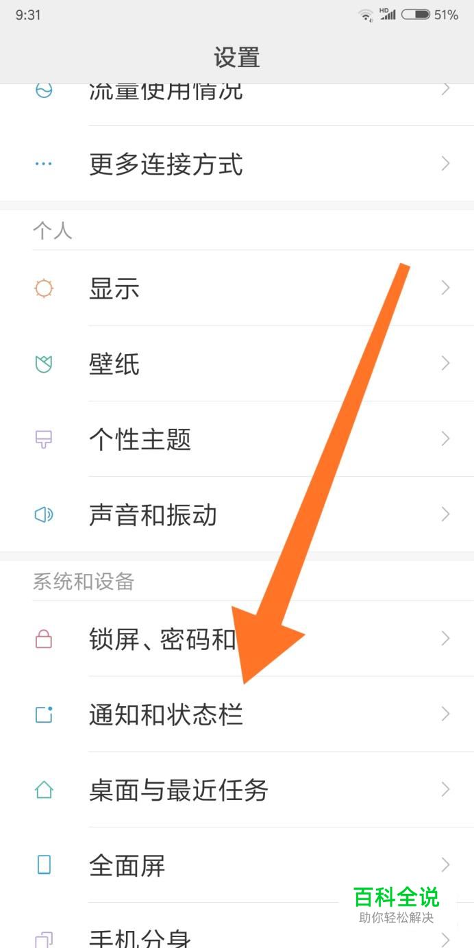然后点击进入“通知和状态栏”设置选项。