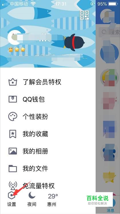 点击头像后会看到文件、收藏、相册和设置等等的功能,我们点击设置。
