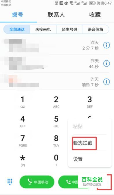 弹出的界面,我们点击右下角的设置,弹出的界面,我们点击骚扰拦截;