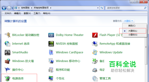 打开控制面板选项后,点击查看方式,选择大图标,点击电源选项